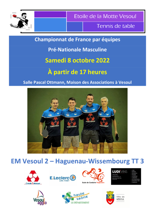 Après une défaite encourageante lors de la première journée de championnat au niveau pré-nationale, nous allons pouvoir retrouver l’équipe 2 de l’EM Vesoul Tennis de Table à domicile contre la 3ème équipe de l’entente d’Haguenau-Wissembourg. Ce match sera important pour la suite de la saison et notamment pour le maintien contre une équipe du même calibre et avec les mêmes ambitions. L’objectif de nos joueurs est clair, remporter ce match.