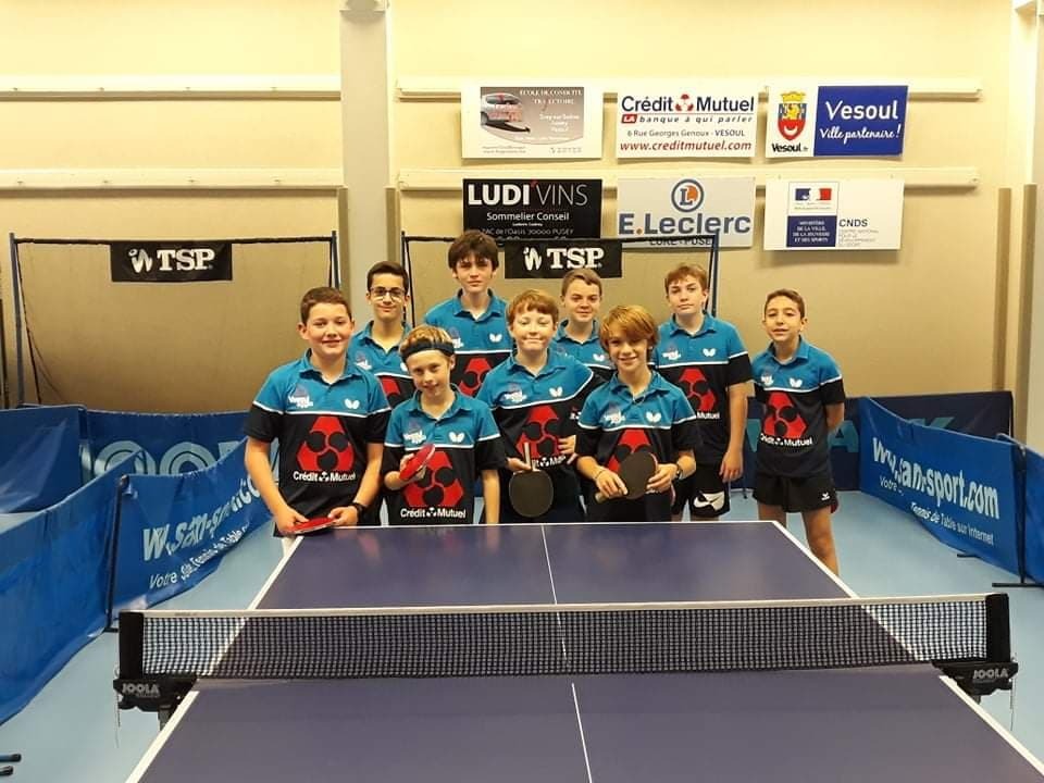 En Pré-Nationale, la défaite n’était pas envisageable pour nos vésuliens. Ils affrontaient un de leur adversaires direct au maintien, Romilly SP10 1. Un début de rencontre sur les chapeaux de roues pour Vesoul avec la grosse performance de Clément Peney sur le numéro 1 adverse, classé 19, en remportant le match à la belle. Jean-Philippe Bruchon suivra le chemin de son partenaire en performant sur un 17. Titouan Guenon rajoutera un 3ème point avec sa victoire solide sur un 17 également. Laurent Guenot malgré une belle bataille laissera un point à l’équipe adverse. Nos joueurs mènent donc 3-1. S’ensuit la 2ème tournée, Jean-Philippe Bruchon et Laurent Guenot devront respectivement s’incliner sur le 19 et 17 tandis que Clément Peney et Titouan Guenon continuent sur leurs lancées avec des victoires sur deux joueurs classés 17. Le score est donc de 5-3 avant les doubles, un point de part et d’autre sera additionné avec la victoire de Clément et Titouan et la défaite de Laurent et Jean-Philippe, 6-4. Pour finir en beauté, Titouan, Clément et Jean-Philippe remporteront leur 3 simples.