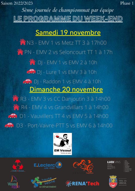 Après un petit week-end sans tennis de table, le championnat par équipe reprend ce week-end avec la 5ème journée du championnat par équipe.